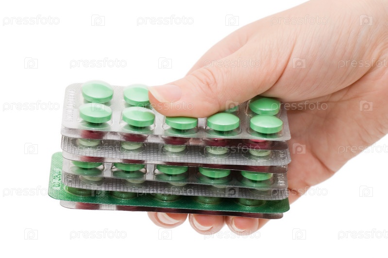 Человеческая рука, держащая стопку разных упаковок с таблетками
