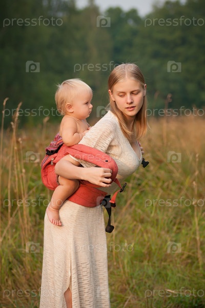 Молодая мать несет ребенка в рюкзаке по полю