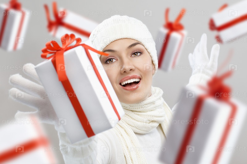 Красивая девушка с новогодними подарками на белом фоне