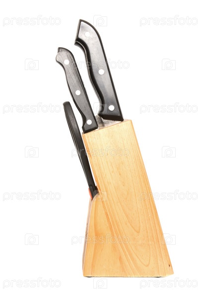 Кухонные ножи в деревянной подставке, изолированы на белом фоне