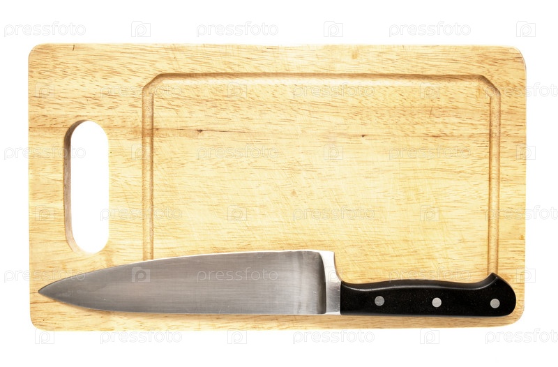 Кухонный нож на деревянной разделочной доске, изолированы на белом фоне