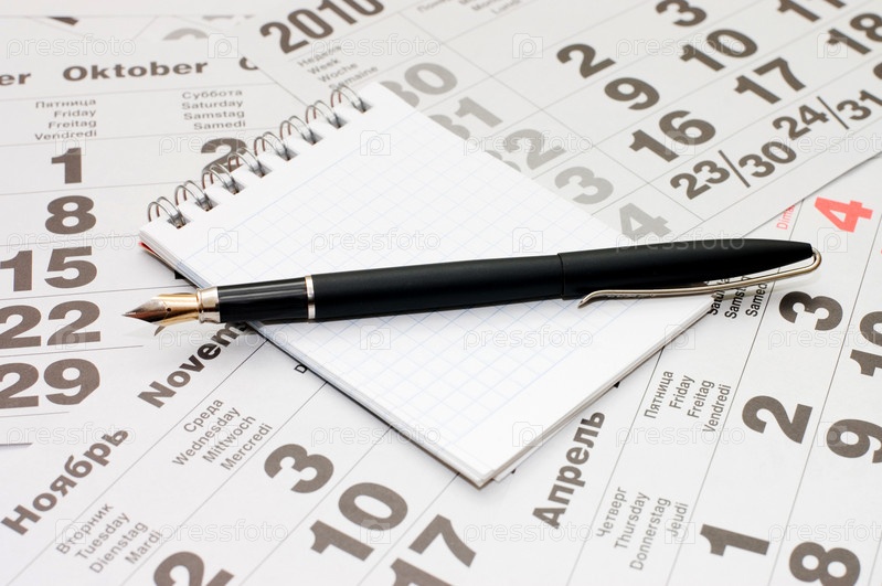 Ручка и блокнот, лежащие на листках отрывного календаря