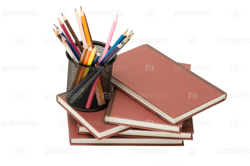 Стопка книг и цветные карандаши в стаканчике на белом фоне