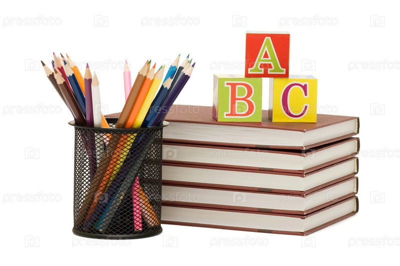 Стопка книг и цветные карандаши в стаканчике на белом фоне