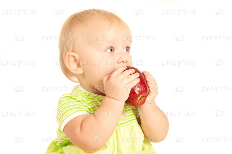 Маленький ребенок ест красное яблоко на белом фоне