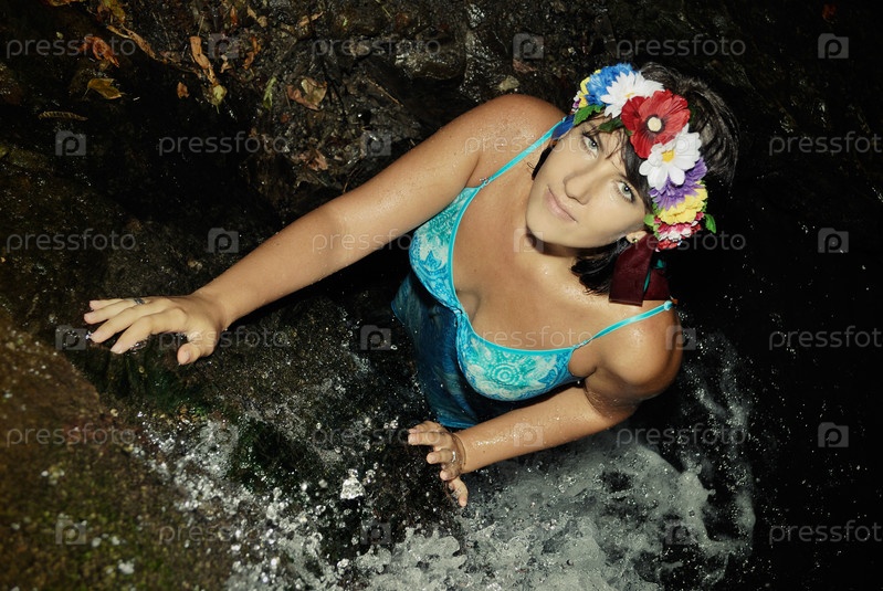Молодая девушка с венком в волосах возле горного ручья