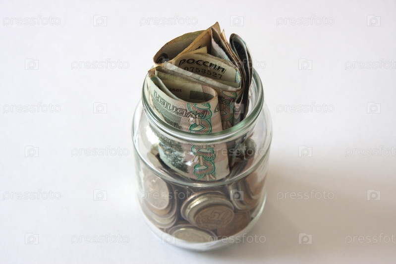 Банка с деньгами на белом фоне