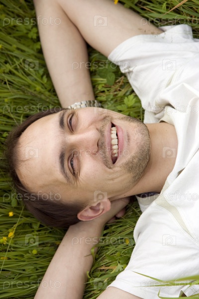 Улыбающийся человек отдыхает на траве