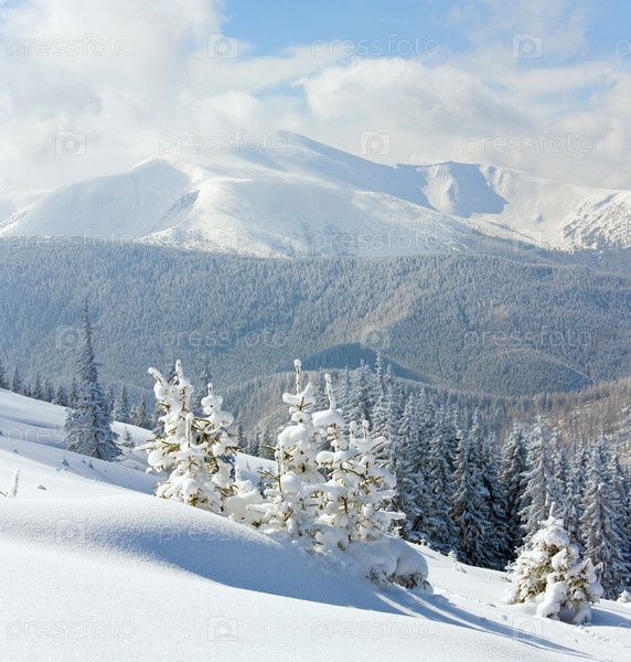Зимнее утро, заснеженный еловый лес и вид на гору Говерла (Карпаты, Украина)