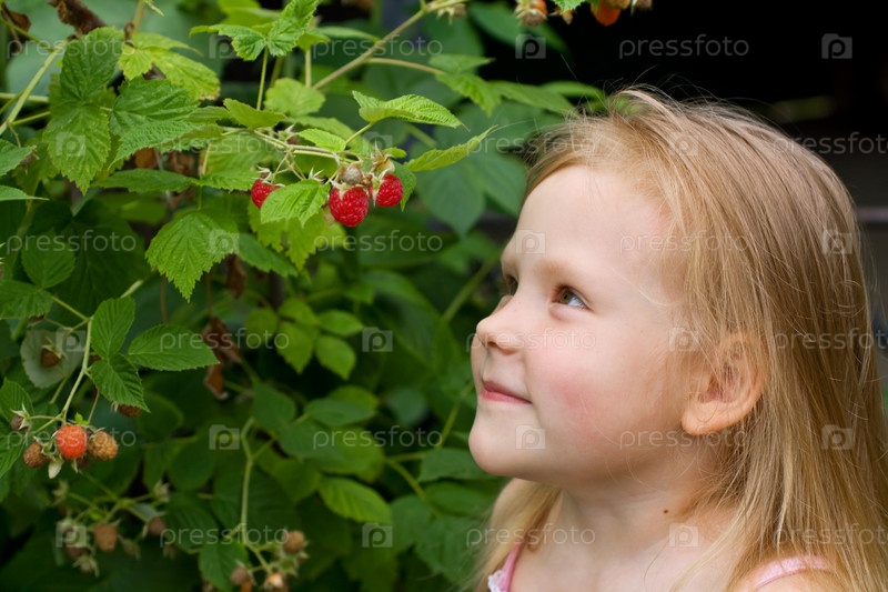 Маленькая девочка смотрит на ягоды малины