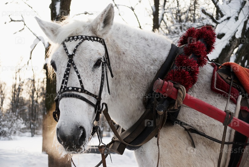 Белый конь в красивой упряжке на морозе