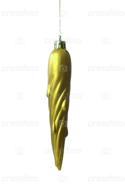 Желтая новогодняя игрушка в виде сосульки на белом фоне
