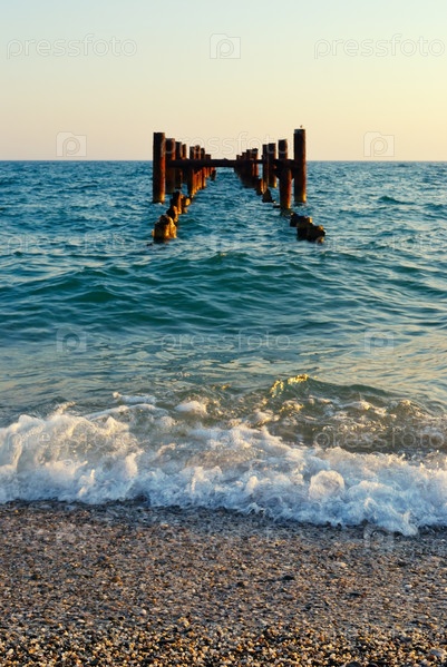 Разрушенный старый причал в закатном свете