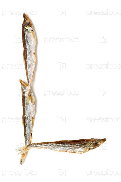 Буква 'L' из мелкой рыбы на белом фоне