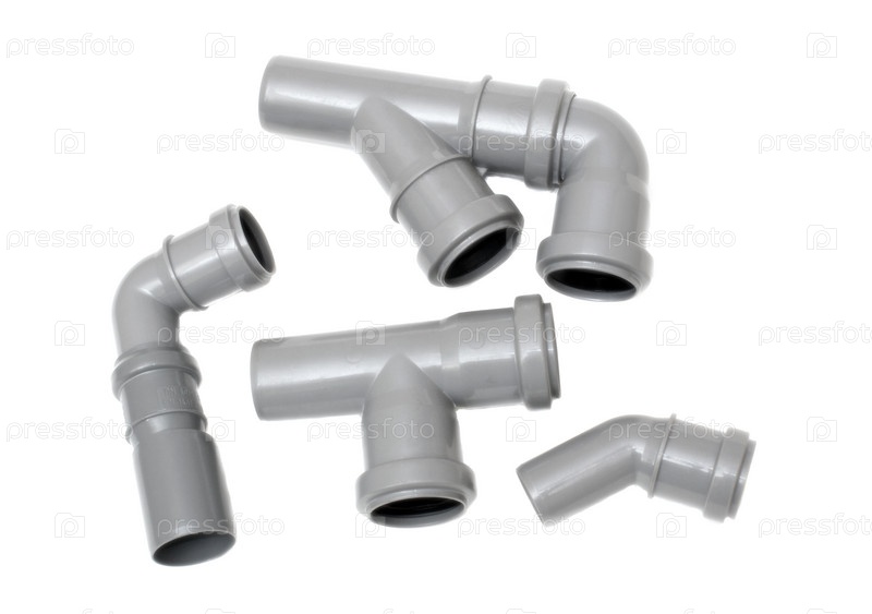 Детали и соединения канализационных труб на белом фоне