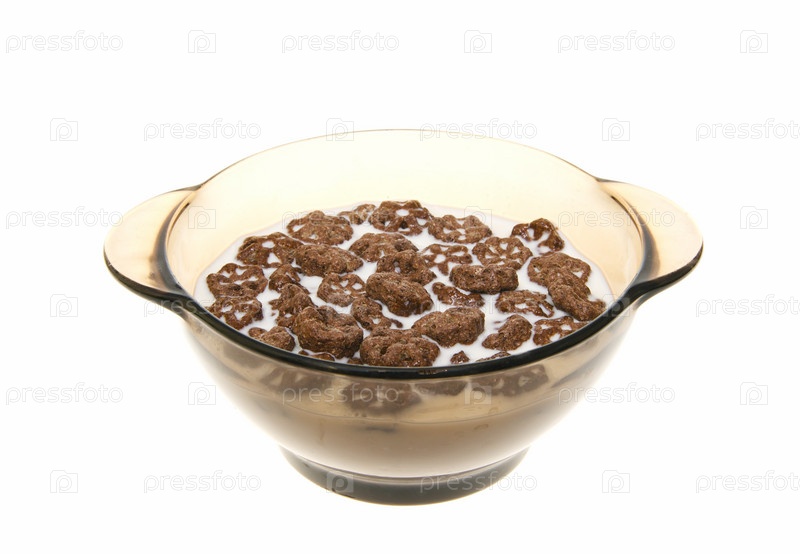Шоколадные хлопья с молоком в чашке на белом фоне