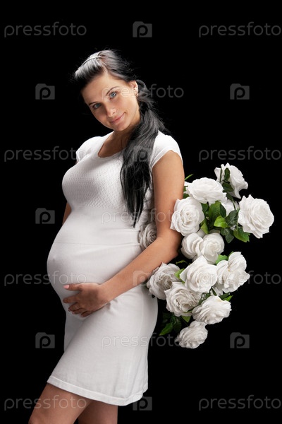 Беременная женщина с розами на черном фоне