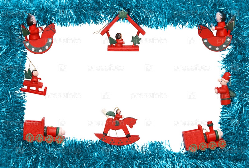 Новогодний шаблон с голубой мишурой и елочными игрушками