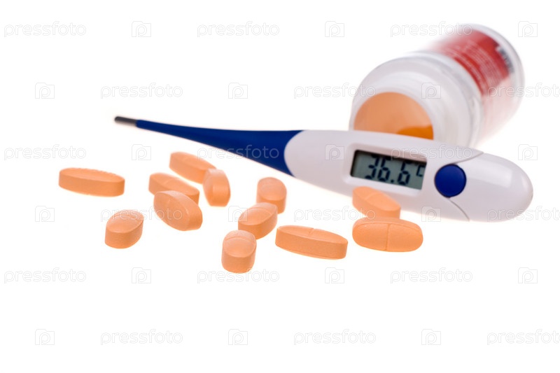 Таблетки и термометр на белом фоне