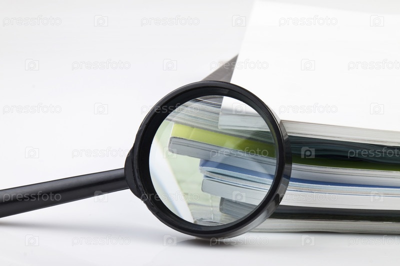 Стопка журналов и лупа на белом фоне