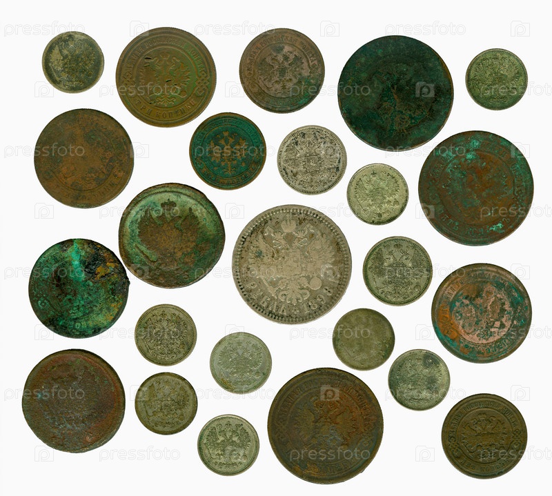Набор старых русских монет на белом фоне