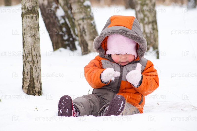 Милый ребенок сидит на снегу в парке