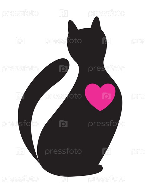 Силуэт черной кошки с розовым сердцем на белом фоне
