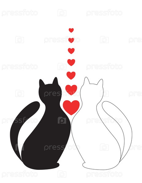 Силуэты черной и белой кошек с красными сердцами на белом фоне