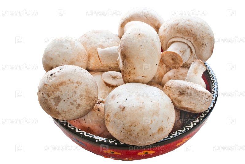 Шампиньоны в миске на белом фоне