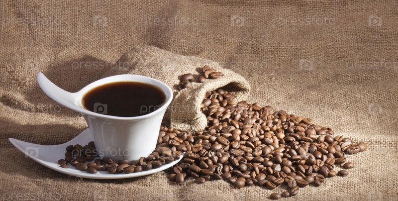 Кофейные зерна и чашка кофе