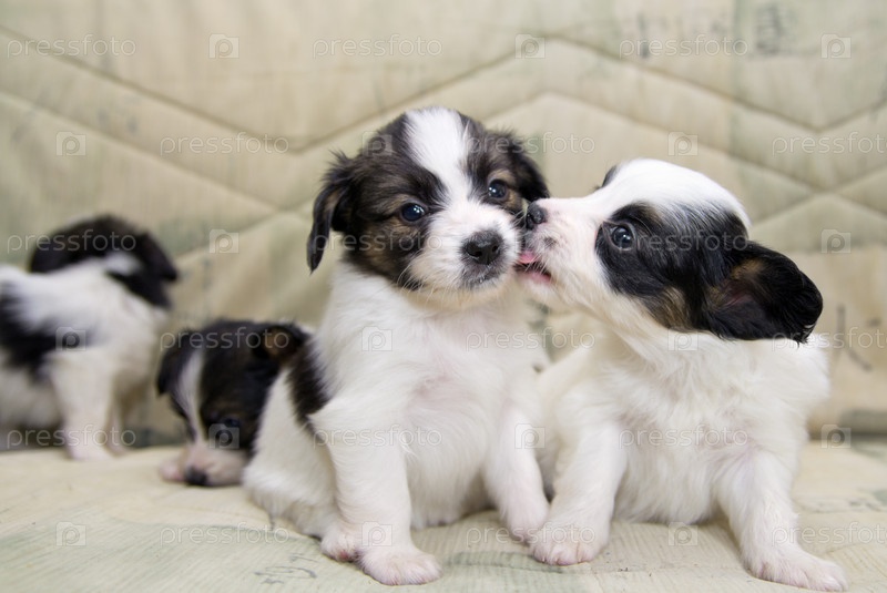 Маленькие щенки папильона играют на диване