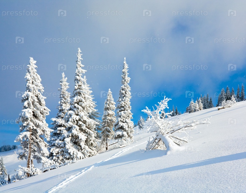 Заснеженные ели на склоне горы на фоне неба