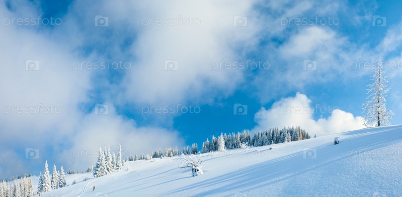 Еловый лес на склоне горы на фоне голубого неба