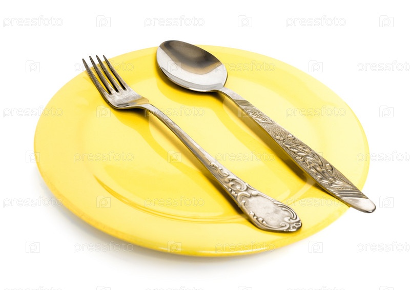Вилка и ложка, лежащие на желтой тарелке