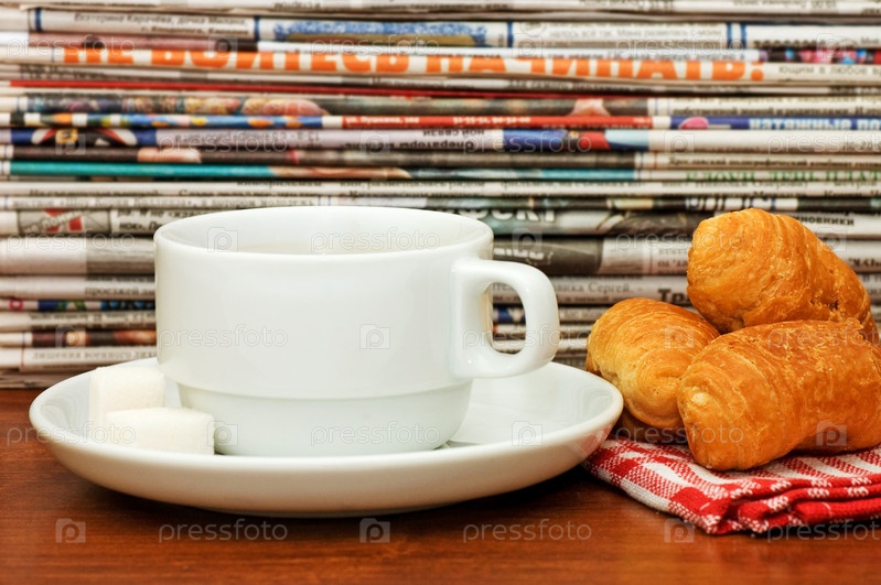 Чашка, круассаны и стопка газет крупным планом