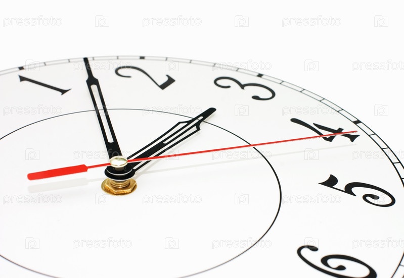 Белые часы, показывающие время около трех часов, изолированные на белом фоне
