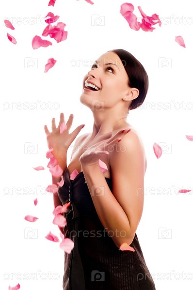 Красивая молодая брюнетка в лепестках роз