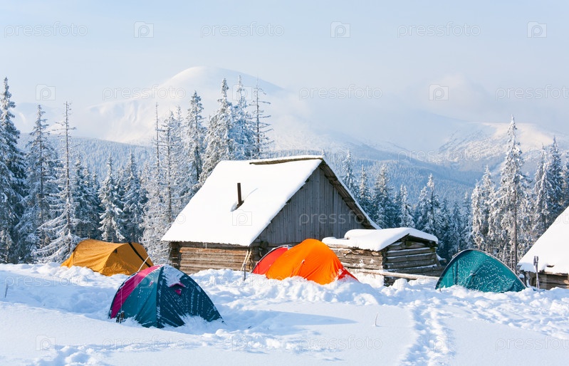 Зимний горный пейзаж с деревянным домиком и туристическими палатками (Куколь горы, Карпаты, Украина)