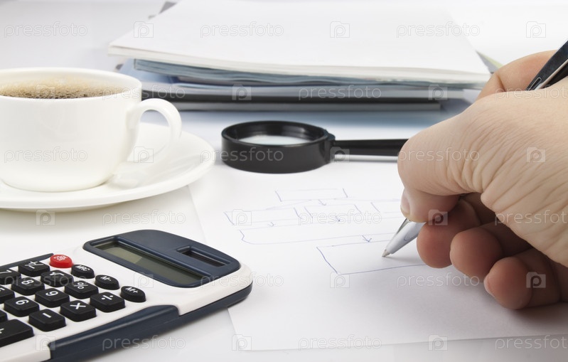 Калькулятор, журналы, ручка и кофе на столе