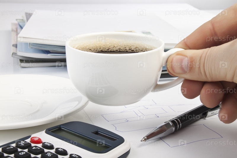 Калькулятор, журналы, ручка и кофе