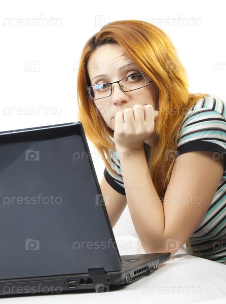 Задумчивая девушка за компьютером