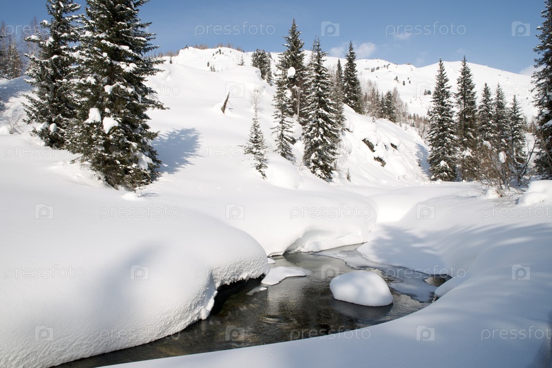 Зимний пейзаж: река, снег, ели