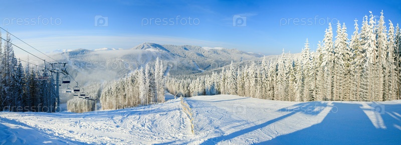 Зимний горный пейзаж с подъемником и лыжным склоном (горнолыжный курорт Буковель)