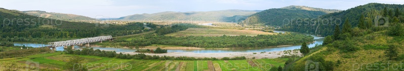 Летнее туманное утро в предгорье, панорама с железной дорогой и рекой (Львовская область, Украина)
