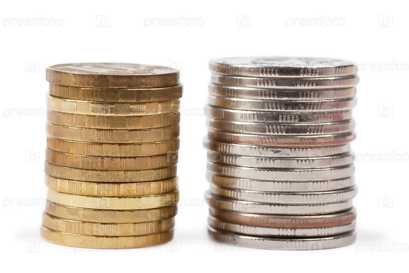 Две стопки монет на белом фоне