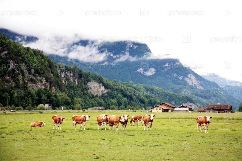 Стадо коров на пастбище на фоне горного тумана