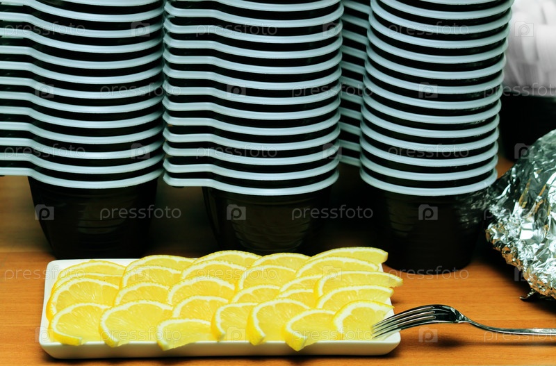 Три стопки одноразовых кружек и нарезанный лимон на столе