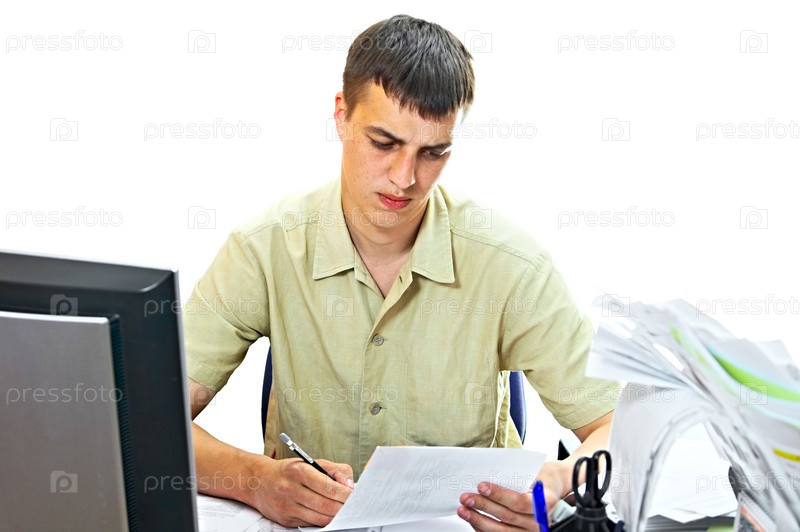 Предприниматель за столом с бумагами на белом фоне