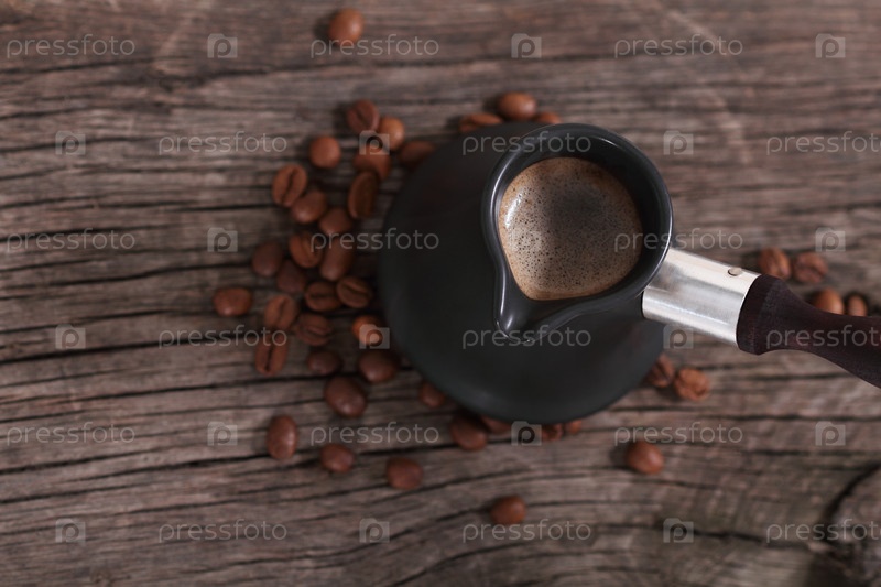 Кофе в турке и кофейные зерна на коричневом фоне. Вид сверху