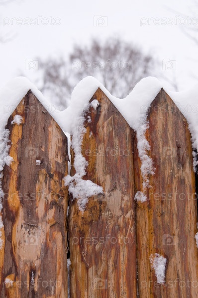 Деревянный забор в снегу крупным планом
